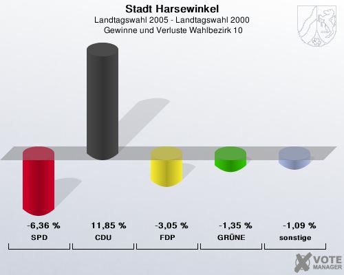 Stadt Harsewinkel, Landtagswahl 2005 - Landtagswahl 2000,  Gewinne und Verluste Wahlbezirk 10: SPD: -6,36 %. CDU: 11,85 %. FDP: -3,05 %. GRÜNE: -1,35 %. sonstige: -1,09 %. http://www.votemanager.de