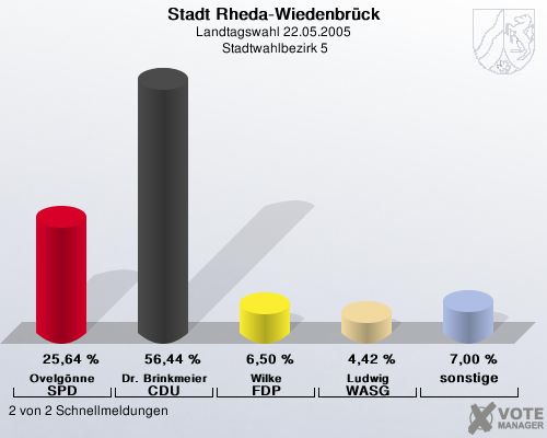 Stadt Rheda-Wiedenbrück, Landtagswahl 22.05.2005,  Stadtwahlbezirk 5: Ovelgönne SPD: 25,64 %. Dr. Brinkmeier CDU: 56,44 %. Wilke FDP: 6,50 %. Ludwig WASG: 4,42 %. sonstige: 7,00 %. 2 von 2 Schnellmeldungenhttp://www.votemanager.de
