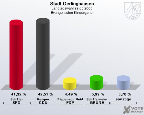 Stadt Oerlinghausen, Landtagswahl 22.05.2005,  Evangelischer Kindergarten: Schäfer SPD: 41,32 %. Kemper CDU: 42,51 %. Pieper-von Heiden FDP: 4,49 %. Schäfermeier GRÜNE: 5,99 %. sonstige: 5,70 %. http://www.votemanager.de