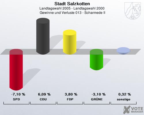 Stadt Salzkotten, Landtagswahl 2005 - Landtagswahl 2000,  Gewinne und Verluste 013 - Scharmede II: SPD: -7,10 %. CDU: 6,09 %. FDP: 3,80 %. GRÜNE: -3,10 %. sonstige: 0,32 %. http://www.votemanager.de