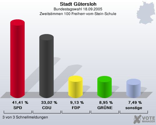 Stadt Gütersloh, Bundestagswahl 18.09.2005, Zweitstimmen 100 Freiherr-vom-Stein-Schule: SPD: 41,41 %. CDU: 33,02 %. FDP: 9,13 %. GRÜNE: 8,95 %. sonstige: 7,49 %. 3 von 3 Schnellmeldungenhttp://www.votemanager.de