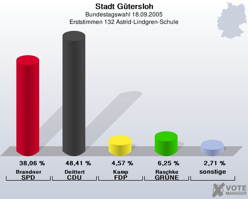 Stadt Gütersloh, Bundestagswahl 18.09.2005, Erststimmen 132 Astrid-Lindgren-Schule: Brandner SPD: 38,06 %. Deittert CDU: 48,41 %. Kamp FDP: 4,57 %. Raschke GRÜNE: 6,25 %. sonstige: 2,71 %. http://www.votemanager.de