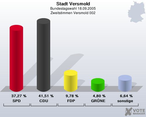 Stadt Versmold, Bundestagswahl 18.09.2005, Zweitstimmen Versmold 002: SPD: 37,27 %. CDU: 41,51 %. FDP: 9,78 %. GRÜNE: 4,80 %. sonstige: 6,64 %. http://www.votemanager.de
