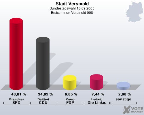 Stadt Versmold, Bundestagswahl 18.09.2005, Erststimmen Versmold 008: Brandner SPD: 48,81 %. Deittert CDU: 34,82 %. Kamp FDP: 6,85 %. Ludwig Die Linke.: 7,44 %. sonstige: 2,08 %. http://www.votemanager.de