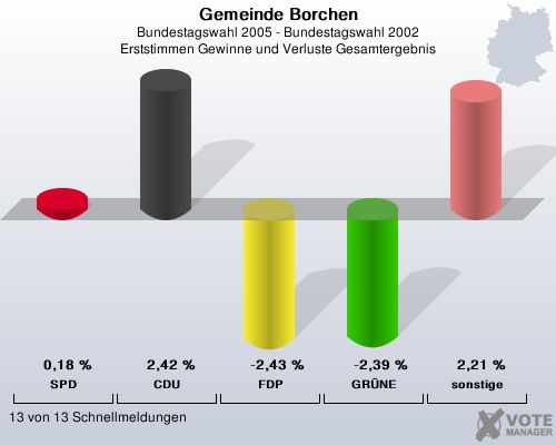 Gemeinde Borchen, Bundestagswahl 2005 - Bundestagswahl 2002, Erststimmen Gewinne und Verluste Gesamtergebnis: SPD: 0,18 %. CDU: 2,42 %. FDP: -2,43 %. GRÜNE: -2,39 %. sonstige: 2,21 %. 13 von 13 Schnellmeldungenhttp://www.votemanager.de