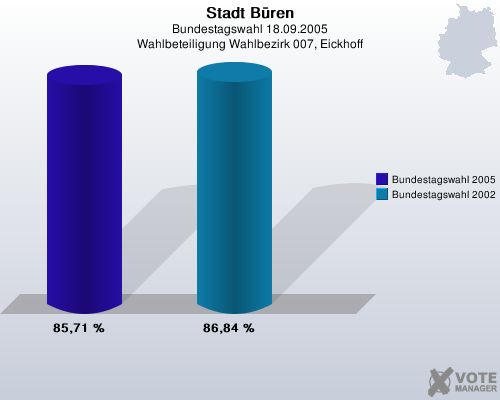 Stadt Büren, Bundestagswahl 18.09.2005, Wahlbeteiligung Wahlbezirk 007, Eickhoff: Bundestagswahl 2005: 85,71 %. Bundestagswahl 2002: 86,84 %. http://www.votemanager.de