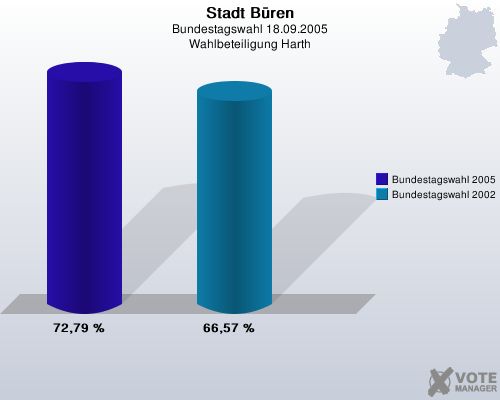 Stadt Büren, Bundestagswahl 18.09.2005, Wahlbeteiligung Harth: Bundestagswahl 2005: 72,79 %. Bundestagswahl 2002: 66,57 %. http://www.votemanager.de