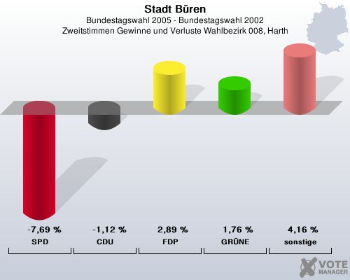 Stadt Büren, Bundestagswahl 2005 - Bundestagswahl 2002, Zweitstimmen Gewinne und Verluste Wahlbezirk 008, Harth: SPD: -7,69 %. CDU: -1,12 %. FDP: 2,89 %. GRÜNE: 1,76 %. sonstige: 4,16 %. http://www.votemanager.de