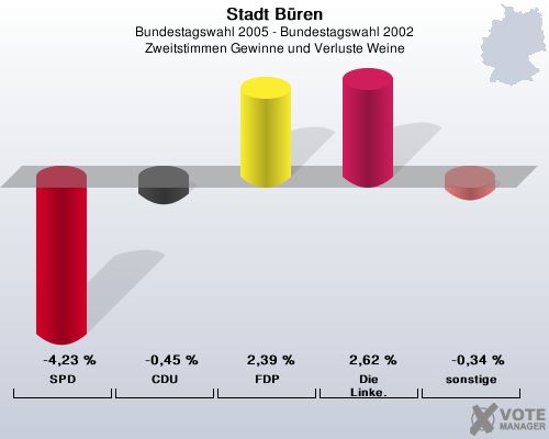 Stadt Büren, Bundestagswahl 2005 - Bundestagswahl 2002, Zweitstimmen Gewinne und Verluste Weine: SPD: -4,23 %. CDU: -0,45 %. FDP: 2,39 %. Die Linke.: 2,62 %. sonstige: -0,34 %. http://www.votemanager.de