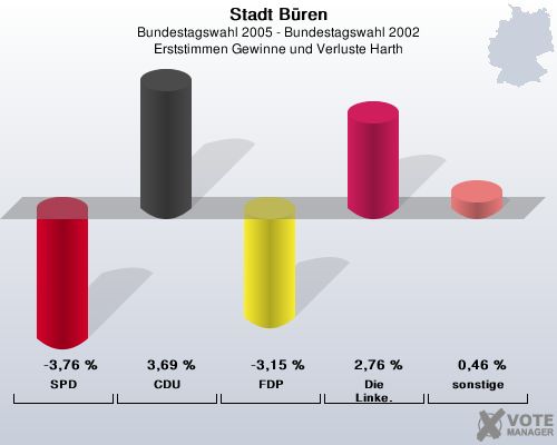 Stadt Büren, Bundestagswahl 2005 - Bundestagswahl 2002, Erststimmen Gewinne und Verluste Harth: SPD: -3,76 %. CDU: 3,69 %. FDP: -3,15 %. Die Linke.: 2,76 %. sonstige: 0,46 %. http://www.votemanager.de