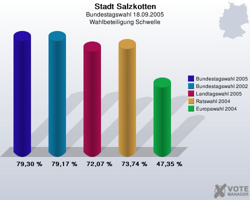 Stadt Salzkotten, Bundestagswahl 18.09.2005, Wahlbeteiligung Schwelle: Bundestagswahl 2005: 79,30 %. Bundestagswahl 2002: 79,17 %. Landtagswahl 2005: 72,07 %. Ratswahl 2004: 73,74 %. Europawahl 2004: 47,35 %. http://www.votemanager.de