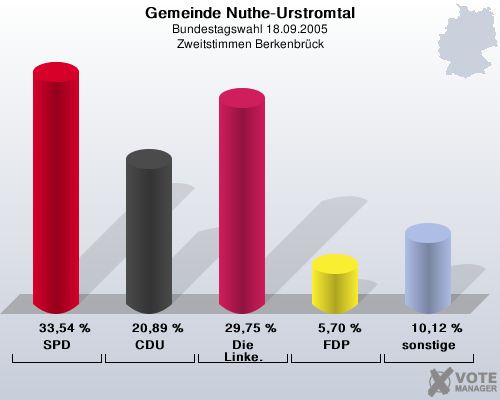 Gemeinde Nuthe-Urstromtal, Bundestagswahl 18.09.2005, Zweitstimmen Berkenbrück: SPD: 33,54 %. CDU: 20,89 %. Die Linke.: 29,75 %. FDP: 5,70 %. sonstige: 10,12 %. http://www.votemanager.de
