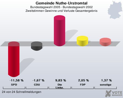 Gemeinde Nuthe-Urstromtal, Bundestagswahl 2005 - Bundestagswahl 2002, Zweitstimmen Gewinne und Verluste Gesamtergebnis: SPD: -11,58 %. CDU: -1,67 %. Die Linke.: 9,83 %. FDP: 2,05 %. sonstige: 1,37 %. 24 von 24 Schnellmeldungenhttp://www.votemanager.de