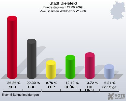 Stadt Bielefeld, Bundestagswahl 27.09.2009, Zweitstimmen Wahlbezirk WBZ06: SPD: 36,86 %. CDU: 22,30 %. FDP: 8,79 %. GRÜNE: 12,10 %. DIE LINKE: 13,72 %. Sonstige: 6,24 %. 5 von 5 Schnellmeldungen http://www.votemanager.de