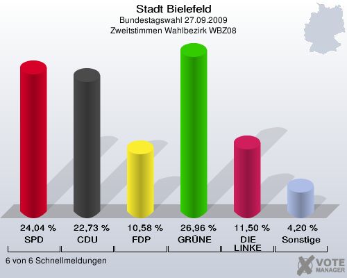 Stadt Bielefeld, Bundestagswahl 27.09.2009, Zweitstimmen Wahlbezirk WBZ08: SPD: 24,04 %. CDU: 22,73 %. FDP: 10,58 %. GRÜNE: 26,96 %. DIE LINKE: 11,50 %. Sonstige: 4,20 %. 6 von 6 Schnellmeldungen http://www.votemanager.de