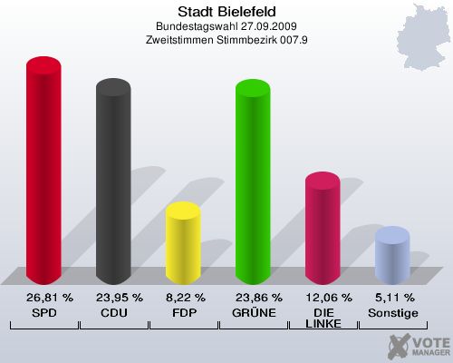 Stadt Bielefeld, Bundestagswahl 27.09.2009, Zweitstimmen Stimmbezirk 007.9: SPD: 26,81 %. CDU: 23,95 %. FDP: 8,22 %. GRÜNE: 23,86 %. DIE LINKE: 12,06 %. Sonstige: 5,11 %. http://www.votemanager.de