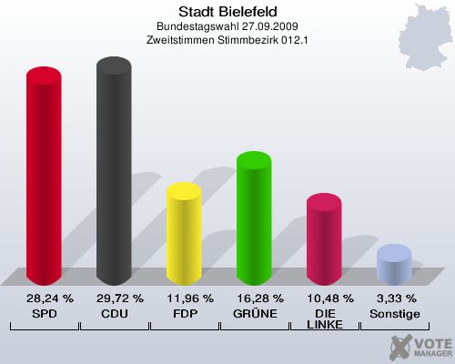 Stadt Bielefeld, Bundestagswahl 27.09.2009, Zweitstimmen Stimmbezirk 012.1: SPD: 28,24 %. CDU: 29,72 %. FDP: 11,96 %. GRÜNE: 16,28 %. DIE LINKE: 10,48 %. Sonstige: 3,33 %. http://www.votemanager.de