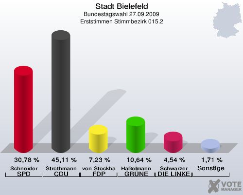 Stadt Bielefeld, Bundestagswahl 27.09.2009, Erststimmen Stimmbezirk 015.2: Schneider SPD: 30,78 %. Strothmann CDU: 45,11 %. von Stockhausen FDP: 7,23 %. Haßelmann GRÜNE: 10,64 %. Schwarzer DIE LINKE: 4,54 %. Sonstige: 1,71 %. http://www.votemanager.de