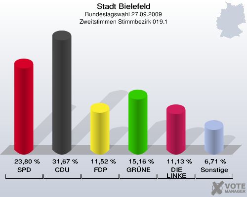 Stadt Bielefeld, Bundestagswahl 27.09.2009, Zweitstimmen Stimmbezirk 019.1: SPD: 23,80 %. CDU: 31,67 %. FDP: 11,52 %. GRÜNE: 15,16 %. DIE LINKE: 11,13 %. Sonstige: 6,71 %. http://www.votemanager.de