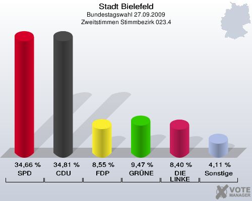 Stadt Bielefeld, Bundestagswahl 27.09.2009, Zweitstimmen Stimmbezirk 023.4: SPD: 34,66 %. CDU: 34,81 %. FDP: 8,55 %. GRÜNE: 9,47 %. DIE LINKE: 8,40 %. Sonstige: 4,11 %. http://www.votemanager.de
