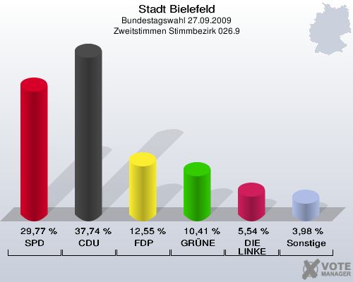 Stadt Bielefeld, Bundestagswahl 27.09.2009, Zweitstimmen Stimmbezirk 026.9: SPD: 29,77 %. CDU: 37,74 %. FDP: 12,55 %. GRÜNE: 10,41 %. DIE LINKE: 5,54 %. Sonstige: 3,98 %. http://www.votemanager.de