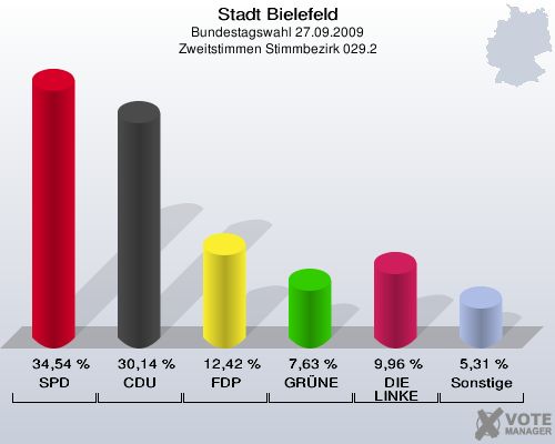 Stadt Bielefeld, Bundestagswahl 27.09.2009, Zweitstimmen Stimmbezirk 029.2: SPD: 34,54 %. CDU: 30,14 %. FDP: 12,42 %. GRÜNE: 7,63 %. DIE LINKE: 9,96 %. Sonstige: 5,31 %. http://www.votemanager.de