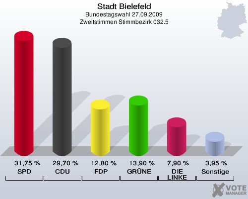 Stadt Bielefeld, Bundestagswahl 27.09.2009, Zweitstimmen Stimmbezirk 032.5: SPD: 31,75 %. CDU: 29,70 %. FDP: 12,80 %. GRÜNE: 13,90 %. DIE LINKE: 7,90 %. Sonstige: 3,95 %. http://www.votemanager.de