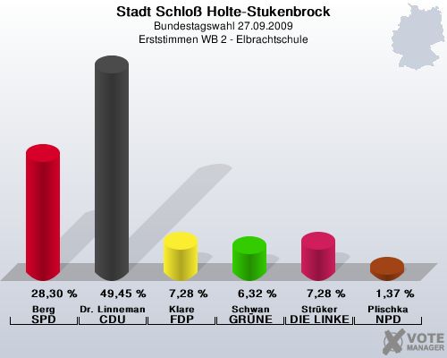 Stadt Schloß Holte-Stukenbrock, Bundestagswahl 27.09.2009, Erststimmen WB 2 - Elbrachtschule: Berg SPD: 28,30 %. Dr. Linnemann CDU: 49,45 %. Klare FDP: 7,28 %. Schwan GRÜNE: 6,32 %. Strüker DIE LINKE: 7,28 %. Plischka NPD: 1,37 %. http://www.votemanager.de