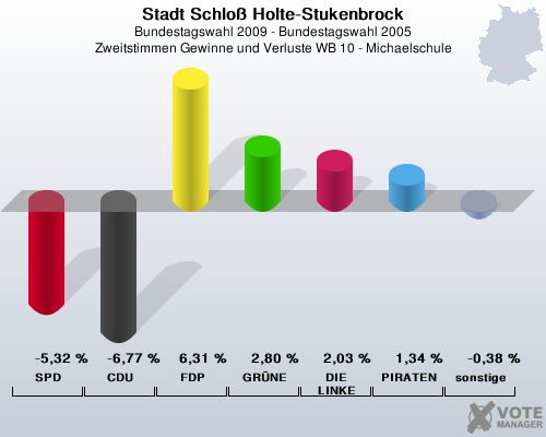 Stadt Schloß Holte-Stukenbrock, Bundestagswahl 2009 - Bundestagswahl 2005, Zweitstimmen Gewinne und Verluste WB 10 - Michaelschule: SPD: -5,32 %. CDU: -6,77 %. FDP: 6,31 %. GRÜNE: 2,80 %. DIE LINKE: 2,03 %. PIRATEN: 1,34 %. sonstige: -0,38 %. http://www.votemanager.de