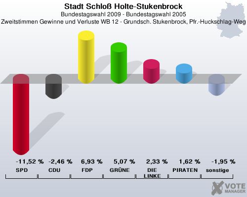 Stadt Schloß Holte-Stukenbrock, Bundestagswahl 2009 - Bundestagswahl 2005, Zweitstimmen Gewinne und Verluste WB 12 - Grundsch. Stukenbrock, Pfr.-Huckschlag-Weg: SPD: -11,52 %. CDU: -2,46 %. FDP: 6,93 %. GRÜNE: 5,07 %. DIE LINKE: 2,33 %. PIRATEN: 1,62 %. sonstige: -1,95 %. http://www.votemanager.de