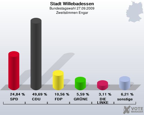 Stadt Willebadessen, Bundestagswahl 27.09.2009, Zweitstimmen Engar: SPD: 24,84 %. CDU: 49,69 %. FDP: 10,56 %. GRÜNE: 5,59 %. DIE LINKE: 3,11 %. sonstige: 6,21 %. http://www.votemanager.de
