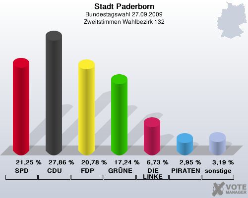 Stadt Paderborn, Bundestagswahl 27.09.2009, Zweitstimmen Wahlbezirk 132: SPD: 21,25 %. CDU: 27,86 %. FDP: 20,78 %. GRÜNE: 17,24 %. DIE LINKE: 6,73 %. PIRATEN: 2,95 %. sonstige: 3,19 %. http://www.votemanager.de
