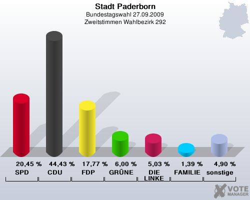 Stadt Paderborn, Bundestagswahl 27.09.2009, Zweitstimmen Wahlbezirk 292: SPD: 20,45 %. CDU: 44,43 %. FDP: 17,77 %. GRÜNE: 6,00 %. DIE LINKE: 5,03 %. FAMILIE: 1,39 %. sonstige: 4,90 %. http://www.votemanager.de