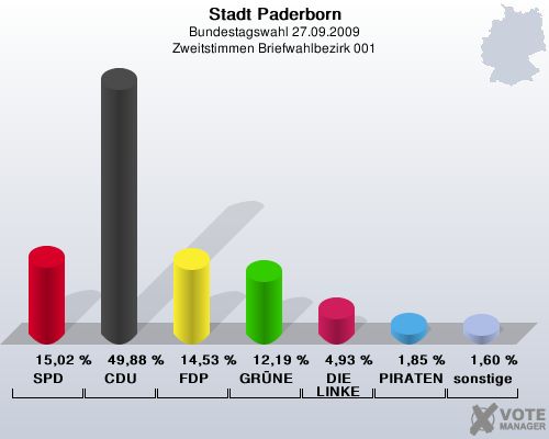 Stadt Paderborn, Bundestagswahl 27.09.2009, Zweitstimmen Briefwahlbezirk 001: SPD: 15,02 %. CDU: 49,88 %. FDP: 14,53 %. GRÜNE: 12,19 %. DIE LINKE: 4,93 %. PIRATEN: 1,85 %. sonstige: 1,60 %. http://www.votemanager.de