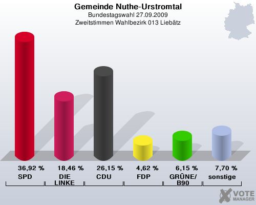 Gemeinde Nuthe-Urstromtal, Bundestagswahl 27.09.2009, Zweitstimmen Wahlbezirk 013 Liebätz: SPD: 36,92 %. DIE LINKE: 18,46 %. CDU: 26,15 %. FDP: 4,62 %. GRÜNE/B90: 6,15 %. sonstige: 7,70 %. http://www.votemanager.de