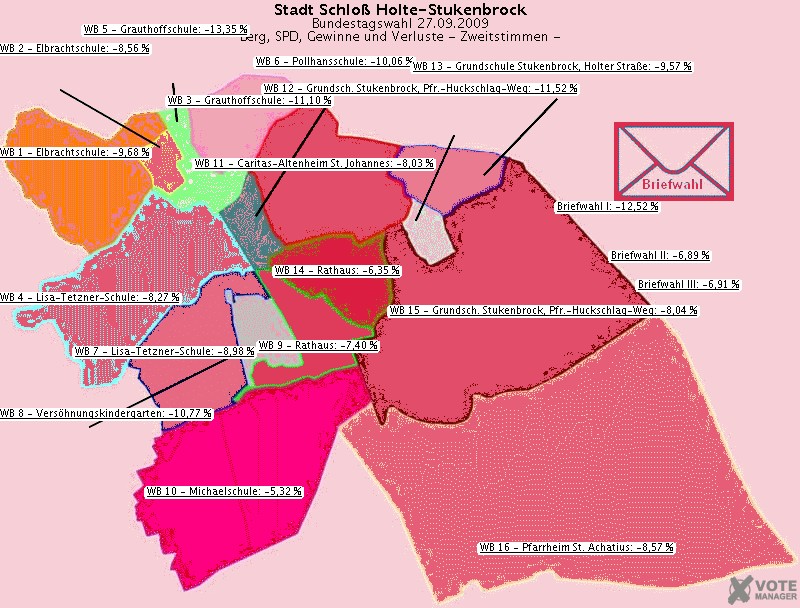 GeoGrafik Berg, SPD, Gewinne und VerlusteWB 1 - Elbrachtschule: SPD: 23,94 %, CDU: 38,78 %, FDP: 14,96 %, GRÜNE: 11,28 %, DIE LINKE: 5,06 %, PIRATEN: 2,30 %, Sonstige: 3,71 %WB 4 - Lisa-Tetzner-Schule: SPD: 20,53 %, CDU: 42,52 %, FDP: 16,42 %, GRÜNE: 7,18 %, DIE LINKE: 5,87 %, PIRATEN: 2,35 %, Sonstige: 5,14 %WB 10 - Michaelschule: SPD: 19,40 %, CDU: 43,48 %, FDP: 18,17 %, GRÜNE: 9,03 %, DIE LINKE: 6,35 %, PIRATEN: 1,34 %, Sonstige: 2,22 %WB 16 - Pfarrheim St. Achatius: SPD: 18,08 %, CDU: 48,16 %, FDP: 15,82 %, GRÜNE: 6,36 %, DIE LINKE: 6,36 %, PIRATEN: 1,98 %, Sonstige: 3,24 %WB 15 - Grundsch. Stukenbrock, Pfr.-Huckschlag-Weg: SPD: 15,27 %, CDU: 46,69 %, FDP: 16,57 %, GRÜNE: 10,09 %, DIE LINKE: 5,91 %, FAMILIE: 1,73 %, Sonstige: 3,74 %WB 9 - Rathaus: SPD: 23,94 %, CDU: 35,02 %, FDP: 18,89 %, GRÜNE: 8,79 %, DIE LINKE: 8,31 %, PIRATEN: 2,28 %, Sonstige: 2,76 %WB 14 - Rathaus: SPD: 22,55 %, CDU: 40,85 %, FDP: 15,46 %, GRÜNE: 8,51 %, DIE LINKE: 8,09 %, NPD: 1,70 %, Sonstige: 2,84 %WB 11 - Caritas-Altenheim St. Johannes: SPD: 24,64 %, CDU: 40,38 %, FDP: 16,03 %, GRÜNE: 6,85 %, DIE LINKE: 6,71 %, PIRATEN: 1,75 %, Sonstige: 3,65 %WB 7 - Lisa-Tetzner-Schule: SPD: 21,15 %, CDU: 42,30 %, FDP: 13,81 %, GRÜNE: 8,35 %, DIE LINKE: 9,64 %, PIRATEN: 1,15 %, Sonstige: 3,60 %WB 3 - Grauthoffschule: SPD: 28,43 %, CDU: 36,00 %, FDP: 13,30 %, GRÜNE: 9,30 %, DIE LINKE: 6,92 %, PIRATEN: 1,95 %, Sonstige: 4,11 %WB 2 - Elbrachtschule: SPD: 24,31 %, CDU: 40,52 %, FDP: 14,97 %, GRÜNE: 7,14 %, DIE LINKE: 7,28 %, PIRATEN: 1,79 %, Sonstige: 3,99 %WB 5 - Grauthoffschule: SPD: 19,53 %, CDU: 38,70 %, FDP: 17,94 %, GRÜNE: 9,58 %, DIE LINKE: 7,74 %, PIRATEN: 3,07 %, Sonstige: 3,45 %WB 6 - Pollhansschule: SPD: 23,42 %, CDU: 42,94 %, FDP: 13,94 %, GRÜNE: 7,06 %, DIE LINKE: 7,81 %, PIRATEN: 1,67 %, Sonstige: 3,17 %WB 12 - Grundsch. Stukenbrock, Pfr.-Huckschlag-Weg: SPD: 16,91 %, CDU: 43,44 %, FDP: 19,22 %, GRÜNE: 10,01 %, DIE LINKE: 5,82 %, PIRATEN: 1,62 %, Sonstige: 2,99 %WB 13 - Grundschule Stukenbrock, Holter Straße: SPD: 17,19 %, CDU: 43,56 %, FDP: 19,70 %, GRÜNE: 8,89 %, DIE LINKE: 6,37 %, PIRATEN: 1,19 %, Sonstige: 3,12 %WB 8 - Versöhnungskindergarten: SPD: 25,67 %, CDU: 35,28 %, FDP: 16,67 %, GRÜNE: 10,83 %, DIE LINKE: 6,93 %, FAMILIE: 1,22 %, Sonstige: 3,40 %Briefwahl II: SPD: 22,80 %, CDU: 44,54 %, FDP: 11,99 %, GRÜNE: 10,58 %, DIE LINKE: 5,05 %, Die Tierschutzpartei: 1,29 %, Sonstige: 3,78 %Briefwahl III: SPD: 19,96 %, CDU: 44,47 %, FDP: 16,70 %, GRÜNE: 9,22 %, DIE LINKE: 5,21 %, PIRATEN: 2,06 %, Sonstige: 2,40 %Briefwahl I: SPD: 20,07 %, CDU: 43,25 %, FDP: 18,45 %, GRÜNE: 7,15 %, DIE LINKE: 6,69 %, NPD: 0,92 %, Sonstige: 3,47 %