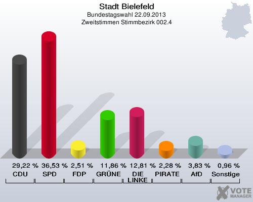 Stadt Bielefeld, Bundestagswahl 22.09.2013, Zweitstimmen Stimmbezirk 002.4: CDU: 29,22 %. SPD: 36,53 %. FDP: 2,51 %. GRÜNE: 11,86 %. DIE LINKE: 12,81 %. PIRATEN: 2,28 %. AfD: 3,83 %. Sonstige: 0,96 %. http://www.votemanager.de