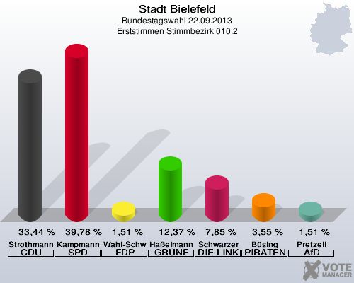Stadt Bielefeld, Bundestagswahl 22.09.2013, Erststimmen Stimmbezirk 010.2: Strothmann CDU: 33,44 %. Kampmann SPD: 39,78 %. Wahl-Schwentker FDP: 1,51 %. Haßelmann GRÜNE: 12,37 %. Schwarzer DIE LINKE: 7,85 %. Büsing PIRATEN: 3,55 %. Pretzell AfD: 1,51 %. http://www.votemanager.de
