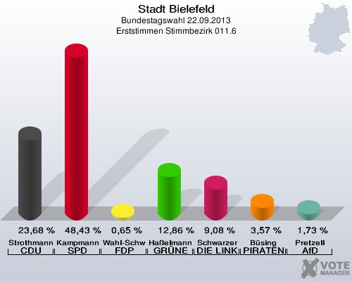 Stadt Bielefeld, Bundestagswahl 22.09.2013, Erststimmen Stimmbezirk 011.6: Strothmann CDU: 23,68 %. Kampmann SPD: 48,43 %. Wahl-Schwentker FDP: 0,65 %. Haßelmann GRÜNE: 12,86 %. Schwarzer DIE LINKE: 9,08 %. Büsing PIRATEN: 3,57 %. Pretzell AfD: 1,73 %. http://www.votemanager.de