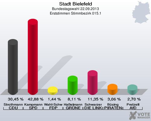 Stadt Bielefeld, Bundestagswahl 22.09.2013, Erststimmen Stimmbezirk 015.1: Strothmann CDU: 30,45 %. Kampmann SPD: 42,88 %. Wahl-Schwentker FDP: 1,44 %. Haßelmann GRÜNE: 8,11 %. Schwarzer DIE LINKE: 11,35 %. Büsing PIRATEN: 3,06 %. Pretzell AfD: 2,70 %. http://www.votemanager.de