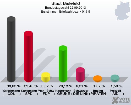 Stadt Bielefeld, Bundestagswahl 22.09.2013, Erststimmen Briefwahlbezirk 013.9: Strothmann CDU: 38,62 %. Kampmann SPD: 29,40 %. Wahl-Schwentker FDP: 3,07 %. Haßelmann GRÜNE: 20,13 %. Schwarzer DIE LINKE: 6,21 %. Büsing PIRATEN: 1,07 %. Pretzell AfD: 1,50 %. http://www.votemanager.de