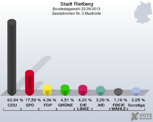 Stadt Rietberg, Bundestagswahl 22.09.2013, Zweitstimmen Nr. 3 Mastholte: CDU: 62,94 %. SPD: 17,59 %. FDP: 4,36 %. GRÜNE: 4,51 %. DIE LINKE: 4,22 %. AfD: 3,20 %. FREIE WÄHLER: 1,16 %. Sonstige: 2,05 %. http://www.votemanager.de