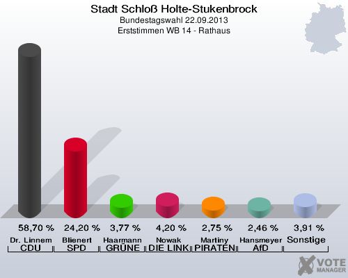 Stadt Schloß Holte-Stukenbrock, Bundestagswahl 22.09.2013, Erststimmen WB 14 - Rathaus: Dr. Linnemann CDU: 58,70 %. Blienert SPD: 24,20 %. Haarmann GRÜNE: 3,77 %. Nowak DIE LINKE: 4,20 %. Martiny PIRATEN: 2,75 %. Hansmeyer AfD: 2,46 %. Sonstige: 3,91 %. http://www.votemanager.de