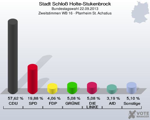 Stadt Schloß Holte-Stukenbrock, Bundestagswahl 22.09.2013, Zweitstimmen WB 16 - Pfarrheim St. Achatius: CDU: 57,62 %. SPD: 19,88 %. FDP: 4,06 %. GRÜNE: 5,08 %. DIE LINKE: 5,08 %. AfD: 3,19 %. Sonstige: 5,10 %. http://www.votemanager.de