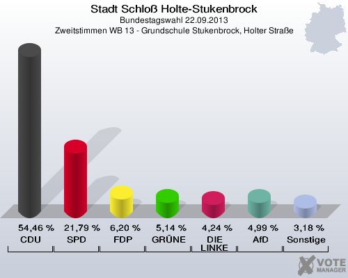 Stadt Schloß Holte-Stukenbrock, Bundestagswahl 22.09.2013, Zweitstimmen WB 13 - Grundschule Stukenbrock, Holter Straße: CDU: 54,46 %. SPD: 21,79 %. FDP: 6,20 %. GRÜNE: 5,14 %. DIE LINKE: 4,24 %. AfD: 4,99 %. Sonstige: 3,18 %. http://www.votemanager.de