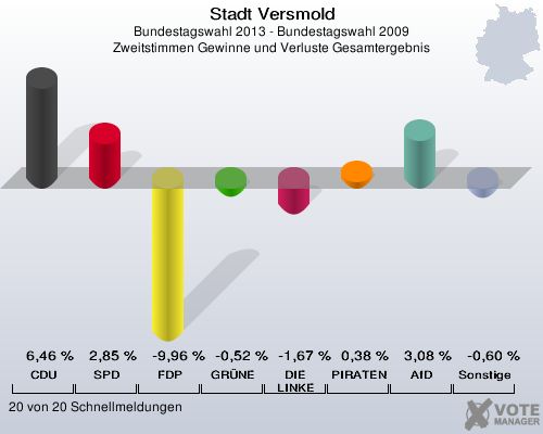 Stadt Versmold, Bundestagswahl 2013 - Bundestagswahl 2009, Zweitstimmen Gewinne und Verluste Gesamtergebnis: CDU: 6,46 %. SPD: 2,85 %. FDP: -9,96 %. GRÜNE: -0,52 %. DIE LINKE: -1,67 %. PIRATEN: 0,38 %. AfD: 3,08 %. Sonstige: -0,60 %. 20 von 20 Schnellmeldungen http://www.votemanager.de