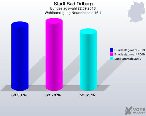 Stadt Bad Driburg, Bundestagswahl 22.09.2013, Wahlbeteiligung Neuenheerse 16.1: Bundestagswahl 2013: 60,33 %. Bundestagswahl 2009: 63,70 %. Landtagswahl 2012: 53,61 %. http://www.votemanager.de