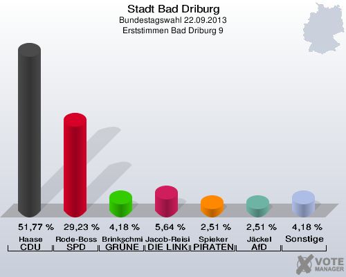 Stadt Bad Driburg, Bundestagswahl 22.09.2013, Erststimmen Bad Driburg 9: Haase CDU: 51,77 %. Rode-Bosse SPD: 29,23 %. Brinkschmidt GRÜNE: 4,18 %. Jacob-Reisinger DIE LINKE: 5,64 %. Spieker PIRATEN: 2,51 %. Jäckel AfD: 2,51 %. Sonstige: 4,18 %. http://www.votemanager.de