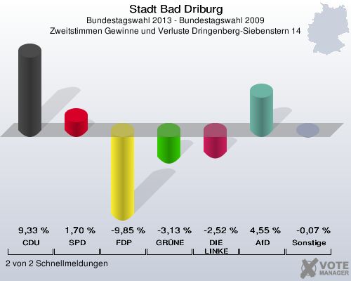 Stadt Bad Driburg, Bundestagswahl 2013 - Bundestagswahl 2009, Zweitstimmen Gewinne und Verluste Dringenberg-Siebenstern 14: CDU: 9,33 %. SPD: 1,70 %. FDP: -9,85 %. GRÜNE: -3,13 %. DIE LINKE: -2,52 %. AfD: 4,55 %. Sonstige: -0,07 %. 2 von 2 Schnellmeldungen http://www.votemanager.de