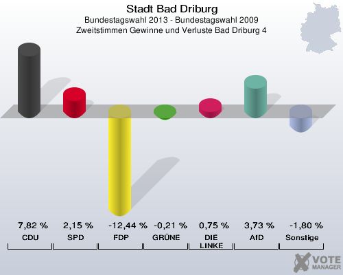 Stadt Bad Driburg, Bundestagswahl 2013 - Bundestagswahl 2009, Zweitstimmen Gewinne und Verluste Bad Driburg 4: CDU: 7,82 %. SPD: 2,15 %. FDP: -12,44 %. GRÜNE: -0,21 %. DIE LINKE: 0,75 %. AfD: 3,73 %. Sonstige: -1,80 %. http://www.votemanager.de